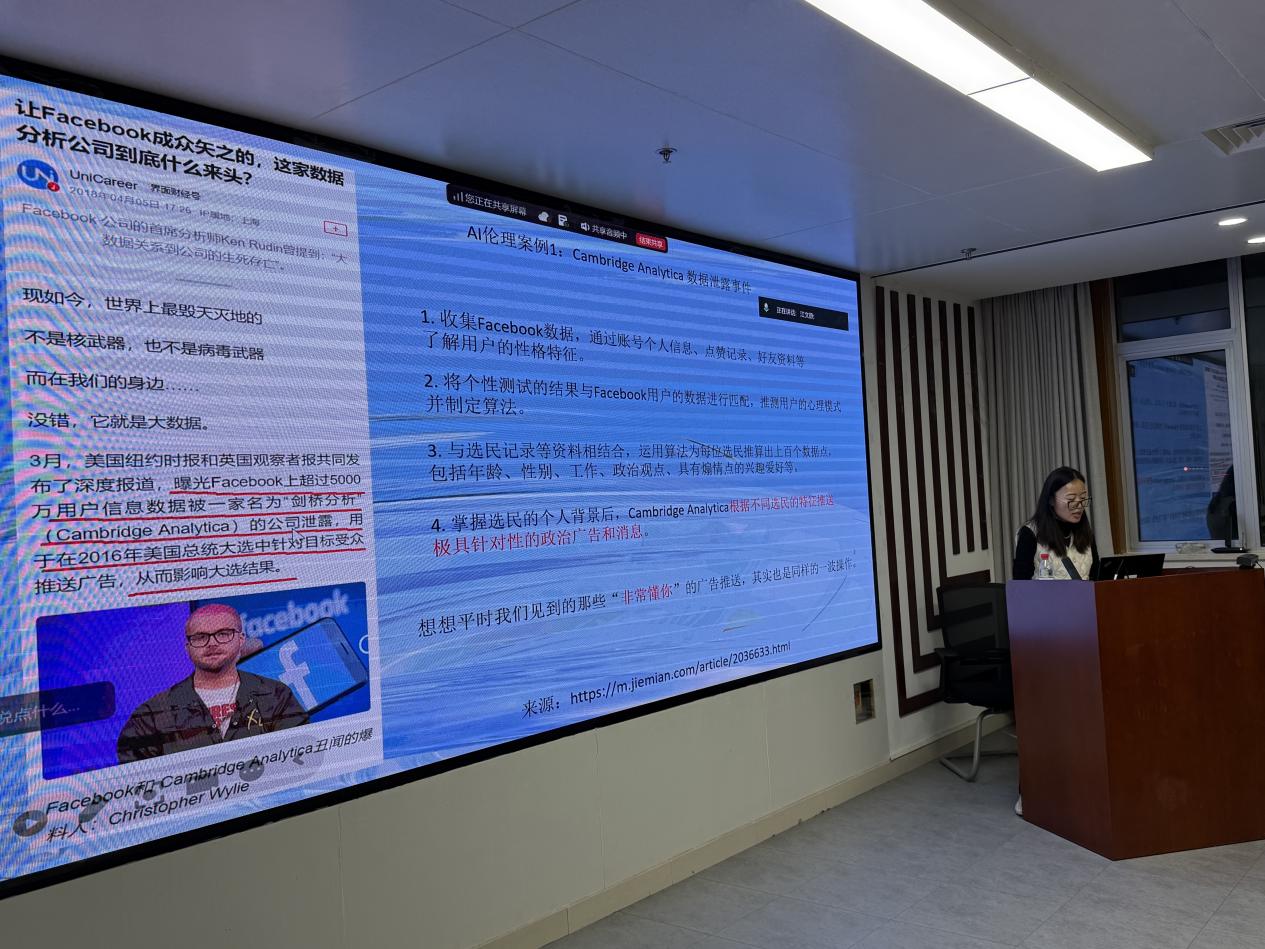 在展示AI强大赋能的同时,杨老师以更大篇幅着重探讨了AI伦理与学术诚信这一关键议题,通过经典的“剑桥分析数据泄露”案例,引出了AI在社会中道德运作的规则问题,并深刻指出,AI在为科研带来便利的同时,也对科研诚信建设提出了严峻挑战,如学术不端、技术依赖和评估困境等。对此,杨老师明确了同学们必须坚守的伦理底线:以“求实诚信”为根基,以“成长发展伦理”为核心,并最终追求“知识创新伦理”的上限,并提出了六点具体建议,包括尊重隐私与数据安全、增强研究过程的透明度、以及最关键的是建立研究者的主体性地位,呼吁同学们做工具的掌控者,而非被动的使用者。