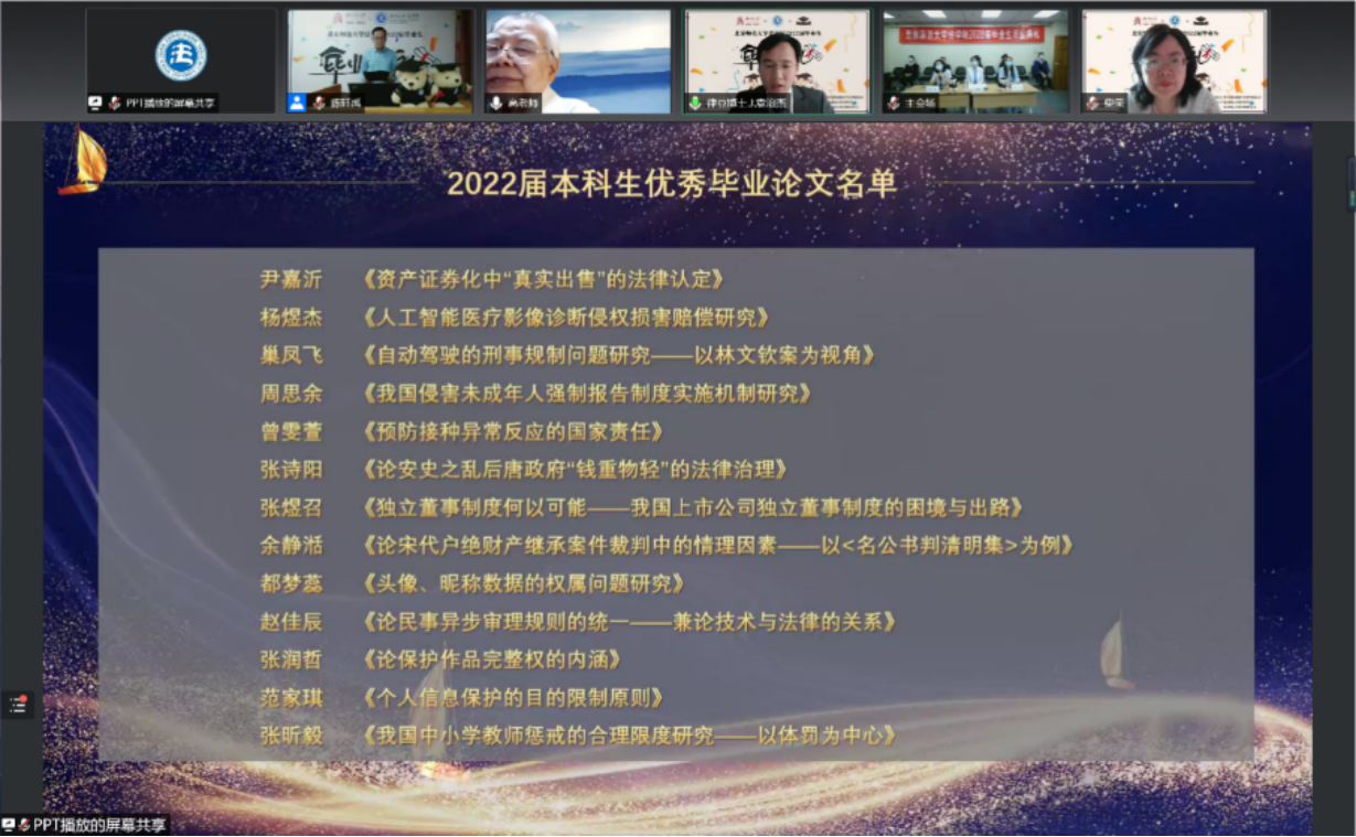 袁治杰教授宣读了2022届本科生优秀毕业论文及第二学士学位(法学)优秀毕业论文获奖名单,并祝全体毕业生同学们乘风破浪十万里,直上云天揽日月。(滑动查看具体名单)