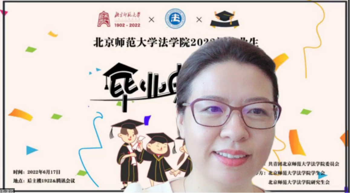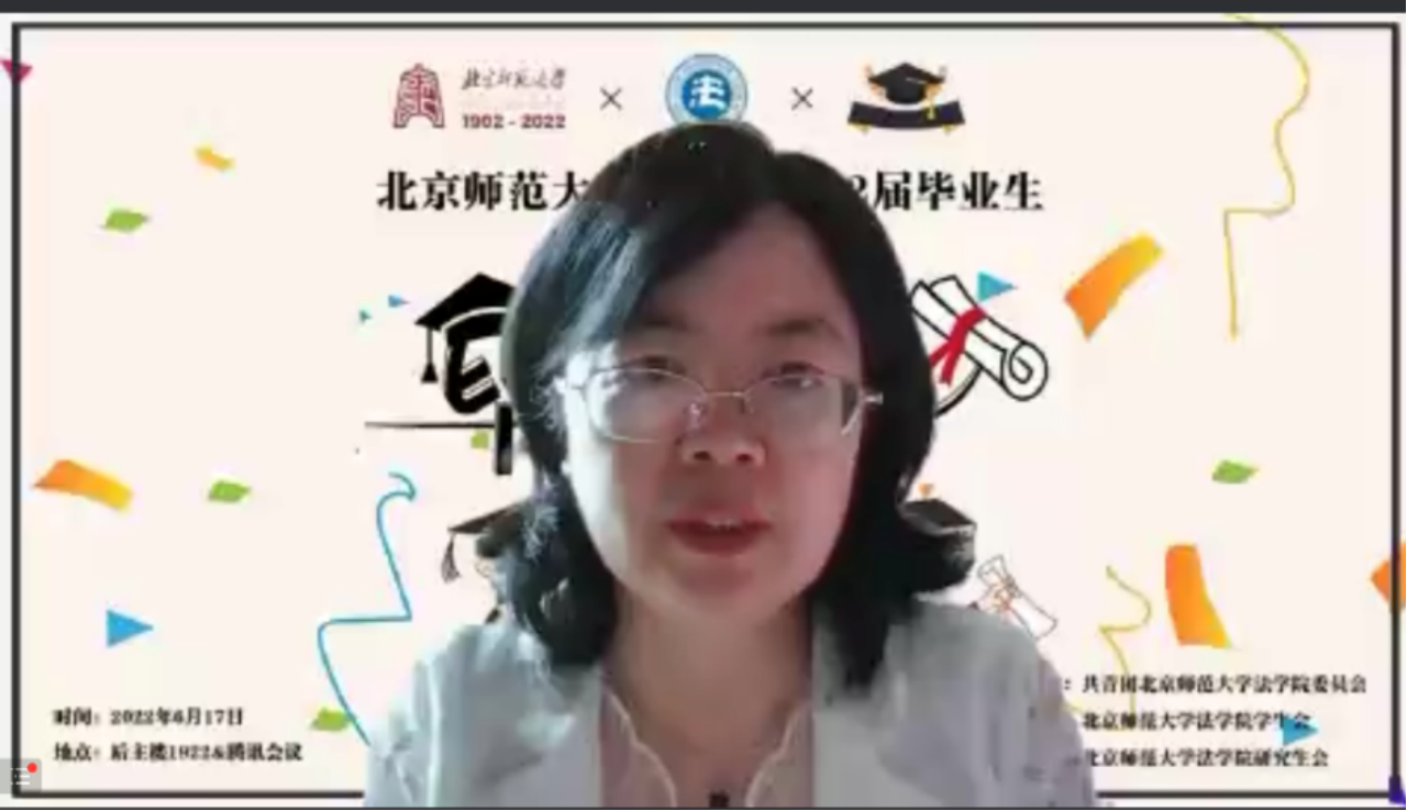 劳佳琦副教授首先热烈祝贺同学们通过自己的努力和对导师们的折磨顺利拿到了学位,然后与同学们分享了自己在监狱调研时的人生感悟:第一,人生应该有底线思维,作为法律人,更要以法律来约束自己,时刻保持对法律红线与道德准则的敬畏;第二,尽管我们无法消灭欲望,但是一定要警惕和管理自己的欲望,不要被欲望奴役和吞噬,更不要被他人左右自己的欲望;第三,人生实难,唯有勇敢面对,至暗时刻,人一定要有拔着自己的头发,把自己从泥潭里面拉出来的勇气和狠劲。最后,她祝愿同学们能够打拼出一个美好的人生,创造出一个更好的世界。