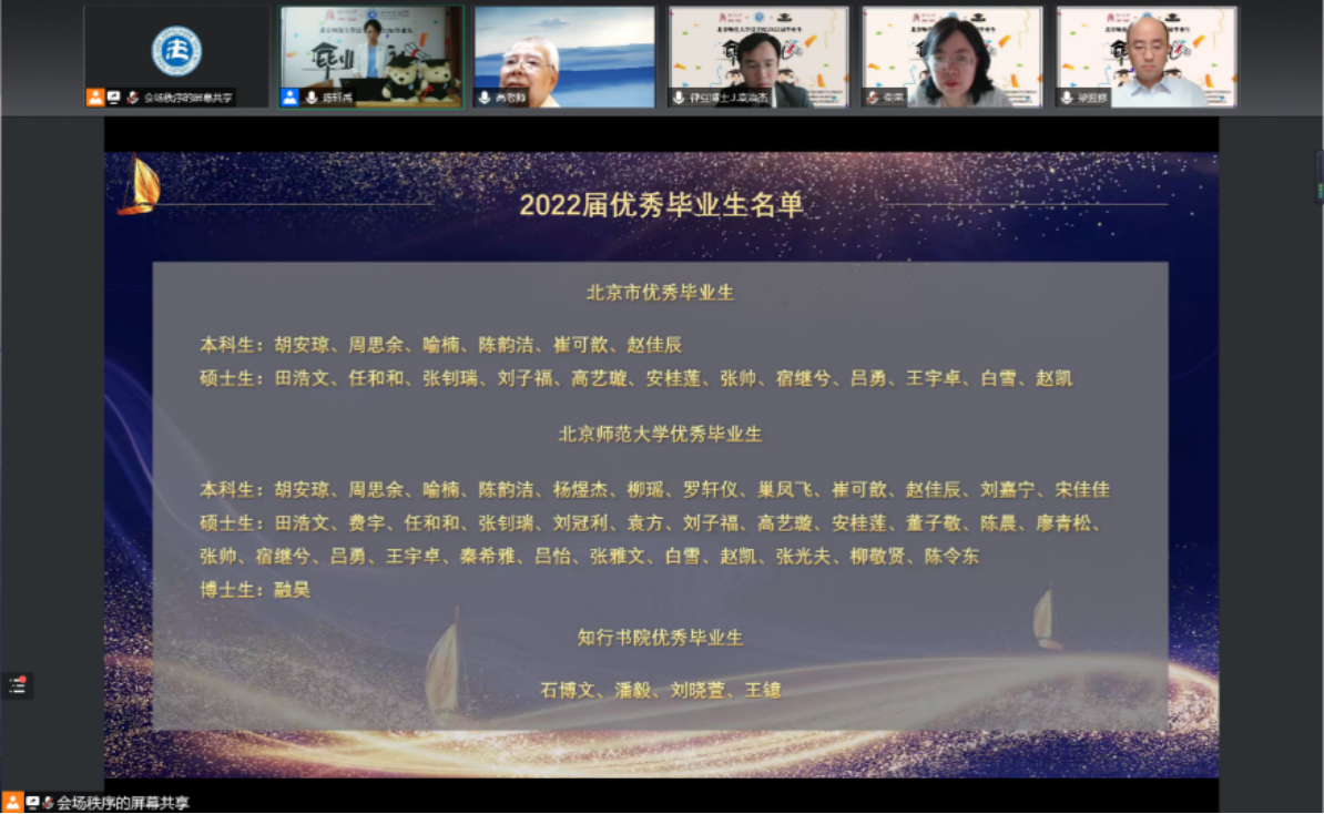 郭雅婷老师宣读了2022届优秀毕业生获奖名单,其中包括北京市优秀毕业生名单、北京师范大学优秀毕业生名单和知行书院优秀毕业生名单。
