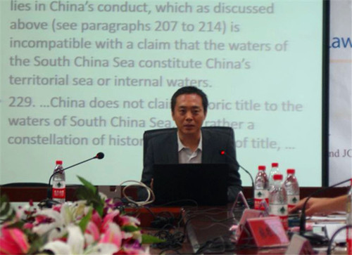 李滨教授作了关于临时仲裁庭对Historic titles(历史性所有权)解释问题的报告。李滨教授从理论研究的角度分析了“历史性所有权”概念,指出中这个术语的概念范围不仅包括所有权的含义也包含着权力依据的意义。报告中批驳了临时仲裁庭对Historic title(历史性所有权)的解释方法,指出仲裁庭将这个概念机械地等同于“主权的主张”、历史性水域或历史性海湾,裁决对Historic title解释不符合条约解释的一般国际法规则,与《条约法公约》第31,33条的解释规则相悖。李滨教授指出,仲裁庭为说明其对于菲律宾的诉求拥有管辖权,在解释Historic title(历史性所有权)时表现出很大的任意性,也不符合公约的目的和宗旨。