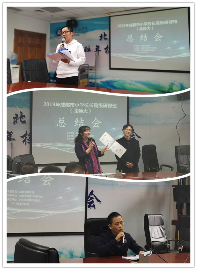 24日下午,2019年成都市教育局小学校长高级研修班总结交流会如期召开,五位学员代表就几天来的培训学习体会和收获进行总结分享。学员们均表示在北京师范大学的收获颇丰,尤其是多种学习方式并行,丰富有趣。教授们的理论知识使他们理念得以迅速提升,受益匪浅;进入两所学校的实地考察交流,让理论联系实际,直观感受好的教育理念是如何落地生根;课后小组研讨,促使学员们增进友情,成为教育践行的伙伴。同时,五位学员还进行了反思,认为还需要通过学习提升自己的角色意识,审视自己的位置和职责,进而调整自己的思想和行为,校长如何将管理的理论和想法落于实际,还需要进一步的探索学习。
