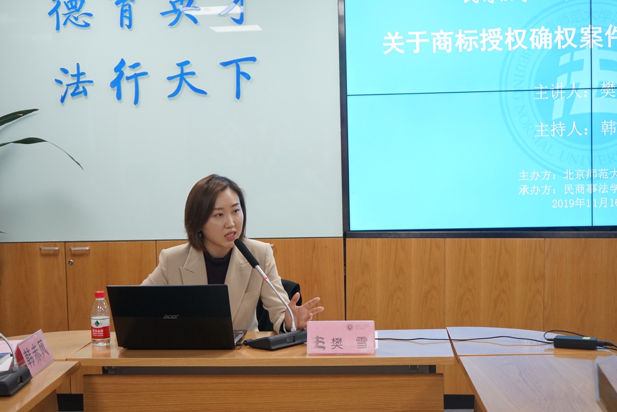 2019年11月16日下午15时30分,北京师范大学民商法学术前沿系列讲座第二场——“关于商标授权确权案件的相关法律问题”在北京师范大学后主楼1922会议室成功举办。本次讲座由北京市高级人民法院知识产权庭樊雪法官担任主讲人,少妇色情 民商事法学教研中心主任韩赤风教授担任主持人。少妇色情 本硕博近三十位学生参加了本次讲座。