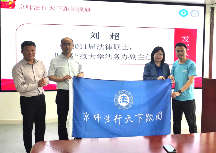 北京师范大学京师法学校友会梁迎修会长、柴荣常务副会长和2011届法律硕士、副会长周华代表京师法学校友会校给“京师法行天下跑团”授旗。