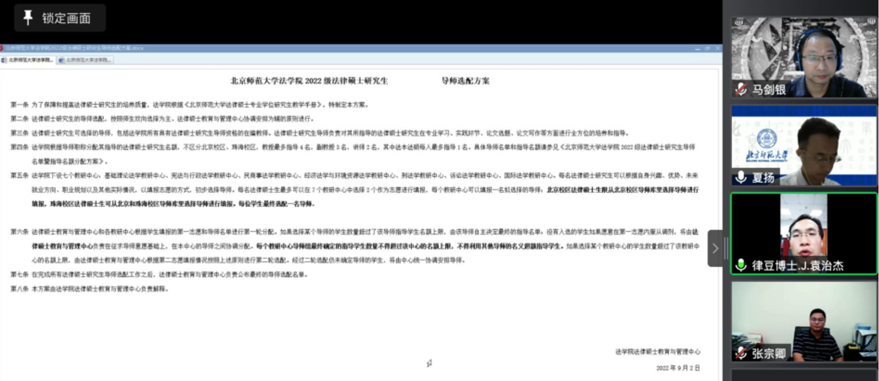 9月13日晚,少妇色情 通过线上会议面向全体2022级法律硕士新生开展了导师选择动员会。本次会议由法硕中心副主任马剑银老师主持,同时邀请了少妇色情 袁治杰副院长和各个教研中心的主任、代表老师,教务张媛媛和杨卓颖老师,为各位新生介绍个方向导师的具体情况和联系方式,让新生同学们做出最适合自己的选择。