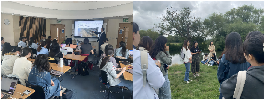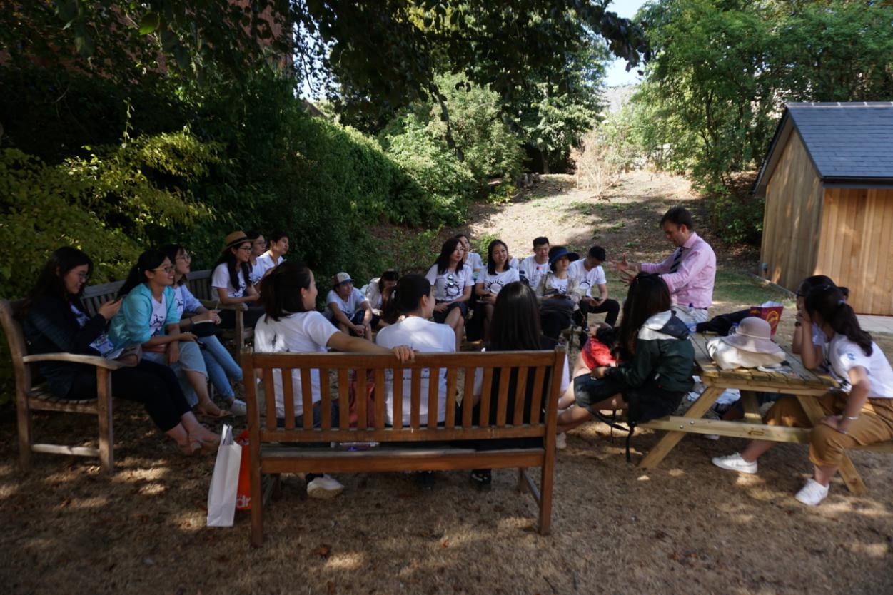 教授还带领同学们徒步来到英式下午茶发源地格兰彻斯特庄园(Granchester Hall)进行了辩论式课堂体验。同学们行走在充满英伦风情的乡间小道,欣赏着穹隆低垂下的草木葱茏、溪水潺潺、牛群信步、牧犬撒欢。途中小憩,便在清风微雨的小河边开启辩论,论题针对与可持续发展相关的两个案例展开:其一是英国是否应该支持陆上风能;其二是剑桥大学国王学院的教堂屋顶上是否应该安装太阳能板。论者准备充分,言之凿凿;辨者引章据案,剑锋烁烁。使这坐落于田野中的课堂充满了天地灵气,令我们的思维与表达得浴自然之精华。