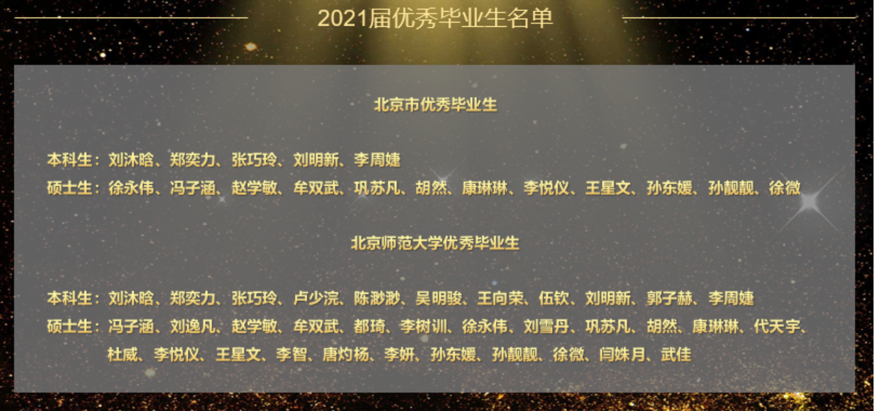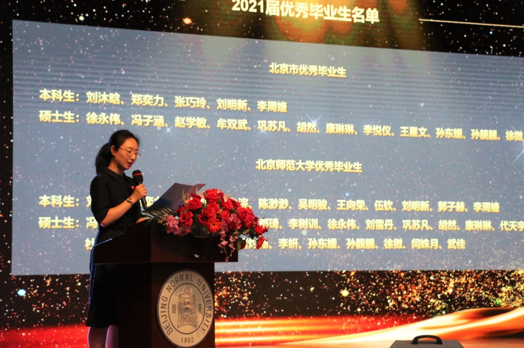 郭雅婷副书记宣读优秀毕业生获奖名单,其中包括北京师范大学优秀毕业生名单和北京市优秀毕业生名单。