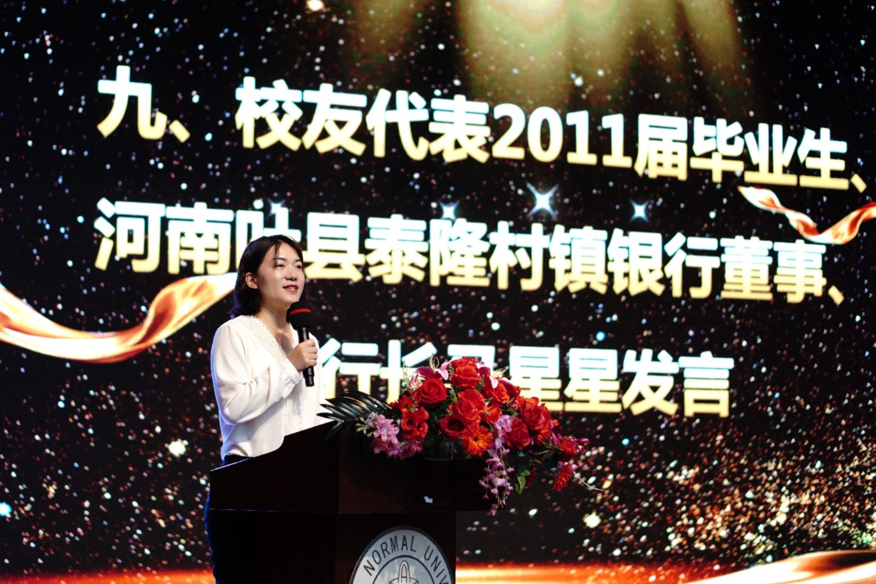 校友代表2011届毕业生、河南叶县泰隆村镇银行董事、副行长马星星发言